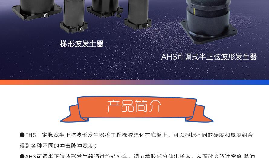 產品型號: 品牌:劍 喬 用途:FHS固定脈寬半正弦波形發生器將工程橡膠硫化在底板上,可以根據不同的硬度和厚度組合得到各種不同的沖擊脈沖寬度。